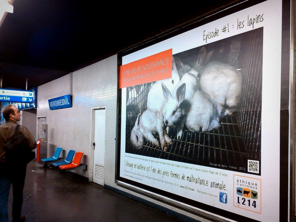 Dans un élevage du Morbihan, en Bretagne, des milliers de lapins destinés à l’alimentation sont enfermés dans un bâtiment où ils vivent l’enfer : des lapereaux agonisent dans leur cage grillagée, d’autres dans la fosse à déjections, certains pendent à travers les grilles des cages, des lapins sont mutilés.