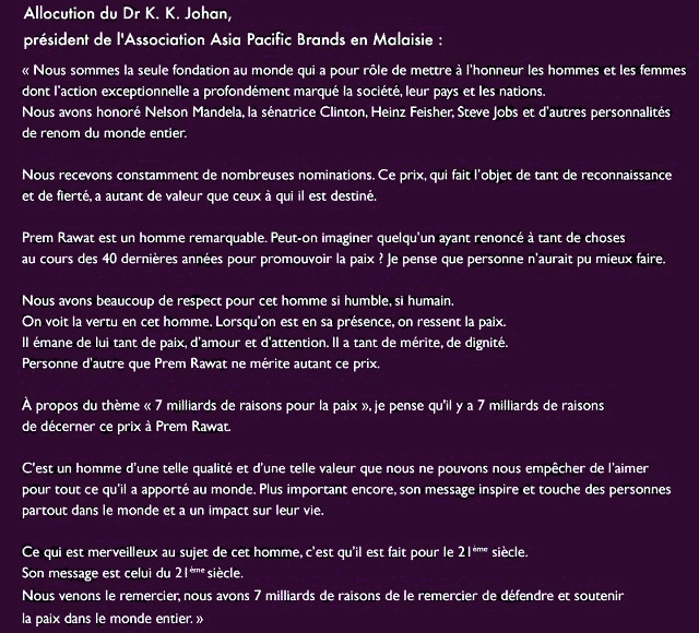 Il est quelqu’un qui ne transige pas sur ses principes, qui affiche une résilience impressionnante contre une pression soutenue, et met finalement les besoins de l’homme et de l’humanité en premier. Prem Rawat est un homme digne de l’admiration de tout le monde et un véritable phare pour l’humanité et pour la paix.