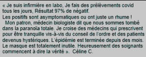 – C’est juste des médecins qui doivent se taire. – C’est juste le personnel de la santé qui n’en peut plus d’être maltraité. – C’est juste des tests inappropriés qui n’informent pas de la maladie. – C’est juste que les cas positifs ne sont ni malades et ni contagieux. – C’est juste que 30 à 40% des tests donnent un résultat erroné. – C’est juste qu’on a enregistré des milliers de décès de la grippe, de la pneumonie ou autre, en accusant à tort le virus du covid. – C’est juste une amende ou une garde à vue et le tribunal pour ceux qui n’obéissent pas.
