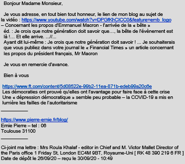 – On a mis la moitié de la planète à l’arrêt pour sauver des vies, il n’y a pas de précédent dans notre histoire…, et ça aura des conséquences dont moi-même je ne sais pas décrire…, mais ça va changer la nature de la mondialisation…,que la pandémie est une crise existentielle pour le projet européen. Puis il tient des propos, d’une extrême gravité ! Il annonce de son propre fait, l’arrivée de la « bête » évoquée dans la Bible.