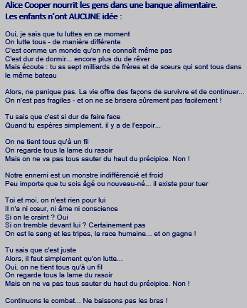 Étonnée, je lui demande pourquoi elle a menti. « Parce que j’ai voulu te protéger, Maman. J’ai senti que ces questions, elles étaient pas normales… Comme si on voulait nous surveiller. Et la dernière question, on nous a demandé si il y avait des gens qui venaient chez nous. Alors j’ai dit non…, parce que c’était trop bizarre, cette question. » Messieurs-dames du gouvernement, vous utilisez nos enfants à notre insu pour nous fliquer. C’est une honte. Vous avez vraiment cru que les enfants allaient vous obéir ?
