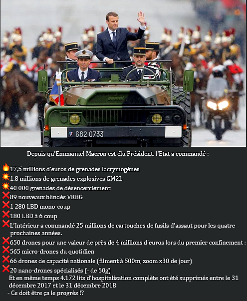 « À la veille du couvre-feu, : en parallèle des prévisions de coupes budgétaires pour les hôpitaux, Macron a privilégié l’augmentation du budget de la police de 325 millions d’euros dont une prime de nuit 15 millions d’euros. Au plus grand bonheur des syndicats, reçut ce mardi à l’Élysée. »
